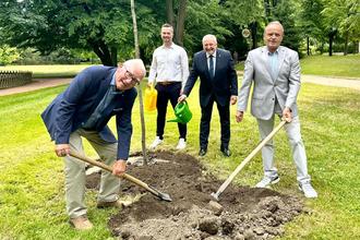Zum Andenken an Dr. Bernhard Thieme wurde eine Felsenbirne im Arthur-Richter-Park gepflanzt, v. l. Autor Dr. Gerhard Brendler, Alexander Sachse, Bürgermeister Peter Mühle und Werner Marschner, langjähriger Vorsitzender des FORTSCHRITT-Traditionsvereins