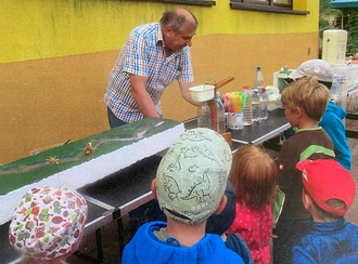 Ferienzeit ist Urlaubszeit und auch viel Zeit für besondere Erlebnisse. Viele kleine und große Leute haben schon entspannte Tage im Urlaub, in der Eisdiele oder im Freibad verbracht. Auftanken, genießen, Kräfte sammeln, neu die Sinne schärfen und uns an allem freuen, was uns geschenkt ist. Ein besonderes Ferienerlebnis für alle Dagebliebenen war eine kindgerechte Vorführung auf unserem Kitagelände zum Thema „Technik zum Be…Greifen“. Gottes Schöpfung entdecken, selbst Dinge mit den eigenen Händen ausprobieren und naturwissenschaftlichen Vorgängen auf den Grund gehen, standen dabei im Vordergrund. Herr Bauer von Technoptikum ermöglichte unseren Kindern anhand von vielen Demonstrationsmodellen einen Einblick in die wunderbare Welt der Technik, Technologie und Wissenschaften. Uns wurde gezeigt wie man zum Beispiel aus Abfall- oder billigen Verbrauchsmaterialien (Korken, Pommes-Gabeln, Zahnstochern) kleine Wasserräder bauen kann, die wir anschließend an einem kleinen Experimentierbachlauf ausprobierten. Wir hatten sehr viel zu Bestaunen und danken Herrn Bauer für die Beantwortung unserer vielen Fragen.