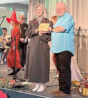 Die Schülersprecherin der Schule und zugleich Vereinsvorsitzende des Theatervereins „Schiller Schüler“ Maria Wunderlich (hier im Kostüm eines Elefanten aus dem „Dschungelbuch“) schenkte Klaus Anders eine „Goldene Eintrittskarte“ für kostenlosen Eintritt für alle Vorstellungen des Schülertheaters auf Lebenszeit