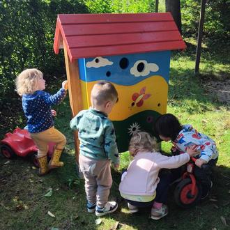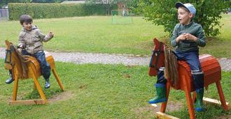 Tatsächlich! Pfiffikus traut seinen Ohren kaum. Seit einigen Tagen wiehert es in seinem Garten und Hufgetrappel ist zu hören. Als er um die Ecke fliegt sieht er, wie seine Schützlinge glücklich auf neuen Holzpferden sitzen, diese füttern und streicheln. Vier Stück entdeckt er und ein großes Ding aus langen Latten, was aussieht wie eine Pyramide. Was ist denn das? „Na ein Zelt!“ rufen die Großen und verkriechen sich freudig im schattigen Spielort. Lange war der kleine Rabe nicht mehr im Außengelände unterwegs. Staunend fliegt er nun auch über den Krippenspielplatz. Da gibt es eine neue Balancier- und Kletterstrecke sowie ein buntes Häuschen mit verschieden großen Löchern. Neugierig fliegt Pfiffikus näher. Ja stimmt, seine kleinsten Schützlinge lieben es die verschiedensten Dinge irgendwo hineinzustecken! „Das hat unser Hausmeister gebaut!“ klären ihn die Kinder auf. Mit Stolz blickt der Rabe auf seinen handwerklich begabten Mitarbeiter. Wie gut, dass wir ihn haben, denkt er und kräht ihm im Vorbeifliegen noch ein „DANKESCHÖN“ zu.