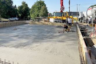 Am 25. August 2023 wurde die Bodenplatte für den Erweiterungsbau am Feuerwehrgerätehaus Krumhermsdorf betoniert. Auch wenn davon nichts mehr zu sehen ist, war die Gründung und Unterfangung unter der Bodenplatte ein aufwendiger Bauabschnitt. Jetzt kann mit dem eigentlichen Hochbau begonnen werden.