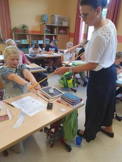 Am 3. September 2025 erlebten wir den Unterricht wie zu Omas und Opas Zeiten. Wir hatten eine sehr strenge Lehrerin, Fräulein Vogt. Alle mussten ganz leise sein und zuhören. Wer nicht hörte, musste auf dem Kirschkernkissen knien oder bekam den Rohrstock zu spüren. In Deutsch lernten wir die altdeutsche Schrift. Diese Buchstaben schrieben wir mit Griffel auf Schiefertafeln oder mit Tinte und Feder auf Papier. Das ist sehr schwierig. Toll war, dass wir alte Schulhefte und Ranzen bestaunen konnten. In der Pause übten wir das Marschieren auf dem Schulhof. Das war irgendwie cool, aber trotzdem würden wir nicht so gerne in der Zeit leben und sind froh, unsere tolle Schule in Oberottendorf zu haben.
