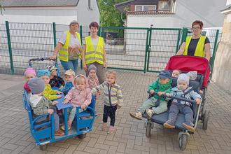 Da uns am 05.09.2025 die Wespen auf dem kleinen Spielplatz am Haus ärgerten, beschlossen die Krippenerzieher mit den Krippenwagen einen Ausflug zum Damwild zu machen. Dort konnten die Kinder Hirsche und Rehe entdeckten, die sich im hohen Gras versteckten. Nach diesem wunderschönen Vormittag waren die kleinen „Minibienen“ sehr müde.