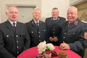 Kamerad Horst Gersch mit seinen Feuerwehrkameraden, v. l. Kay-Uwe Rehn (stellvertretender Gemeindewehrleiter für Technik), Horst Gersch, Michael Förster (Wehrleiter der Ortsfeuerwehr Neustadt) und Bernd Kujau