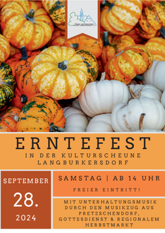 Wir laden ein zum traditionellen Erntefest in die herbstlich geschmückte Kulturscheune für Samstag, den 28. September 2024, ab 14:00 Uhr. Wir beginnen mit einem ökumenischen Gottesdienst und veranstalten einen bunten Herbstmarkt mit vielen tollen Dingen. Für die Kinder gibt es eine Hüpfburg, Bastelmöglichkeiten, Schminken und Reiten. Selbst gebackener Kuchen, Kaffee, Bowle, Fischsemmeln, ungarische Küche - für jeden ist etwas Leckeres dabei. Für Unterhaltungsmusik sorgt an diesem Nachmittag in beschwingter Weise der Musikzug der Freiwilligen Feuerwehr aus Pretzschendorf. Der Eintritt ist frei.