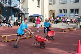 Schubkarrenwettrennen mit Emil (links) und Julian