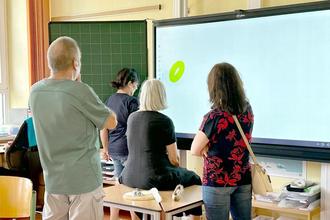Die Lehrerin Jeanette Roy (2. v. l.) beim Vorstellen einer interaktiven Tafel zur Schulführung