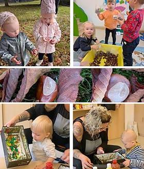„Der Herbst steht auf der Leiter ...“, dieses und viele andere Herbstlieder sind nun vermehrt in unseren Räumen zu hören. Dies macht auch den ganz Kleinen, unseren Nesthüpfern, viel Freude. Mit Eifer wird zur Melodie geklatscht, getanzt und sogar versucht mitzusingen. Doch was macht den Herbst noch aus? Neben vielen bunten Blättern, kälteren Temperaturen und Kürbissen gibt es noch kleine wunderschöne braune Objekte - die Kastanien. So machten sich die Kleinsten bei stürmischem Wind auf die Suche. Bald hatten wir ein Fleckchen gefunden, an dem es vor Kastanien nur so wimmelte. Mit viel Neugier betrachteten sie die verschiedenen Größen und Formen und staunten nicht schlecht, in welchem „Haus“ eine Kastanie das ganze Jahr über so wohnt. Die Stacheln der Kastanienhülle ließen so manchen zurückschrecken. Umso schöner waren das Einsammeln und Befühlen unserer Schätze. Diese trugen wir flink in den Krippenbereich, um am nächsten Tag eine ganze Experimentierwanne damit zu füllen. Ein paar Becher, Autos und Eimer dazu und der Kreativität waren keine Grenzen gesetzt. Es wurde umgefüllt, abtransportiert, gemurmelt und sich sogar mittenrein gesetzt. Langeweile kam da keinesfalls auf. Am nächsten Tag warteten Farben, ein Karton, Blätter und Kastanien auf unsere Krippenkinder. Was wird das wohl werden? Ganz klar, Schüttelbilder. Farbe auf das Papier im Karton klecksen, Kastanien rein und dann bei geschlossenem Deckel solange schütteln, bis die kleinen Arme nicht mehr konnten. Und das Ergebnis? Bunte Kunstwerke und jedes anders schön.
