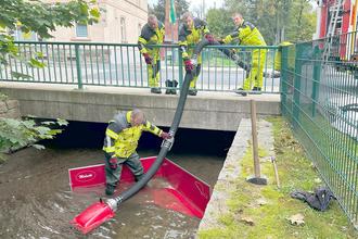 Einsatz der Staustelle „Biber“ zum Anstauen des Wassers, damit genug für die Pumpe (rot) vorhanden ist
