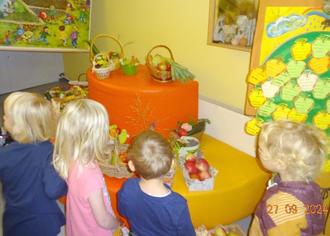 Bereits am Freitag vor dem Gemeindefest schmückten zahlreiche Erntedankkörbchen den Eingangsbereich unserer Kita. Zum gemeinsamen Morgenkreis wurden alle Erntedankgaben in den großen Morgenkreisraum getragen. Wir sangen Lieder und dankten Gott für eine reiche Ernte. Die Regenbogengruppe überraschte alle anderen Kinder mit dem Puppenspiel: Das Rübchen. Das russische Märchen erzählt von einer großen Rübe, die einer allein nicht aus der Erde ziehen konnte. Großvater, Großmutter, Enkelkind, Hund, Katze und Maus sind nötig, um die Rübe zu ernten. Nach der Aufführung wurden die Körbchen zur Kirche gefahren, um sie am Sonntag gemeinsam am Altar abzustellen. Die Erzieher und Kinder eröffneten den Gottesdienst mit dem Lied: „Der Tag erwacht, die Sonne lacht und ich bin richtig froh …“. Wie immer hat die Kita im Anschluss selbstgebackenen Zwiebelkuchen und Federweißer verkauft und gemeinsam mit Eltern und Kindern gebastelt. Ein großes Dankeschön an alle Helfer und Mitwirkenden, auch an die Eltern, die das Fest mit ihren selbstgebackenen Kuchen versüßt haben.
