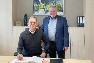 Bürgermeister Georg Schellinger (links) aus Meckenbeuren und Bürgermeister Peter Mühle beim Eintrag ins Gästebuch der Stadt Neustadt in Sachsen