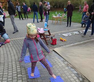 Danach ging es zum großen Büffet, welches aus verschiedenen Brotsorten und Aufstrichen bestand, was die Eltern alles zubereiteten. Auch leckere Teesorten und Wasser mit Kräutern oder Zitrone gab es zum Durststillen. Während des Essens konnte man sich die Chronik der Kita von über 70 Jahren ansehen und danach ging es zur Bewegung über. Mit Skiern für vier Leute schlitterte man über die Wiese oder bewegte sich mit Fahrzeugen und Stelzen durch den Garten. Treffsicherheit wurde beim Dosenschießen geübt und es konnte das Kräuterwissen mit einem Kräutermemory getestet werden. Um den Füßen etwas Gutes zu tun, gab es einen Barfußpfad mit Brennnesseln für ganz Mutige. Auch Tautreten auf Handtüchern stand auf dem Programm. Bei der Kneippschen Säule „Lebensordnung“ konnte man sich schminken lassen oder man legte sich eine neue Frisur zu.