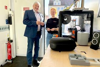 Sandy Speck von der Technischen Hochschule Werdau zeigt Bürgermeister Peter Mühle die verschiedenen Druckerzeugnisse des 3D-Druckers