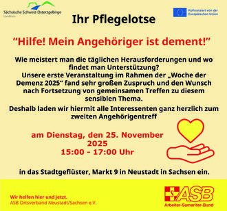 Pflegelotse-Pflegeberatung des ASB Ortsverbandes Neustadt/Sachsen e. V. zu Unterstützungsleistungen, kompetente Beratung vor Ort mit Christian Kowalow und Katrin Berthold, dienstags, 09:00 - 11:00 Uhr.