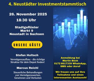 Zum Abschluss des Jahres laden wir herzlich zum 4. Investmentstammtisch ins Neustädter Stadtgeflüster ein. Gemeinsam möchten wir mit euch in den Austausch gehen. Dieses Mal sind zwei Gäste dabei, die die Themen „Vermögensaufbau leicht gemacht“ und „Steuern bei Investments“ beleuchten. Interessierte sind herzlich willkommen, mit uns über die spannende Investmentwelt zu sprechen und sich zu informieren. Für die Teilnahme genügt eine kurze Anmeldung unter 0172 8617339 (Martin Beck). Der Unkostenbeitrag beträgt 5,00 EUR/Person. Wir freuen uns auf eure Teilnahme!