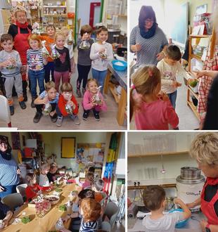 Am 14. November 2023 flogen unsere „Wildbienen“ wieder einmal aus. Unser Ziel war die Kerzenwerkstatt der Förderschule in Polenz. Frau Bürger, die Expertin für die Zauberei, erwartete uns schon. Im Vorfeld hatten wir mit unseren Kindern gesprochen und ihnen erklärt, dass in dieser Schule Kinder lernen, die etwas anders sind als sie. Einige Schüler der Förderschule, die uns begegneten, begrüßten uns freudig. Zu Beginn zeigte uns Frau Bürger, was wir an dem Vormittag herstellen wollten: ein Weihnachtsbäumchen. Nacheinander bekamen alle eine weiße Kerze, die sie mehrmals in heißes Wachs tauchten. Beim ersten Mal wurde bis zehn gezählt, dann bis drei. Die Kerze musste schnell in Granulat, welches haften blieb. Diesen Vorgang wiederholten die Kinder so lange, bis ein Bäumchen entstanden war. In der Zwischenzeit formten die anderen Kinder aus farbigem Knetpapier kleine Kugeln, die dann der Schmuck für das kleine Bäumchen wurden. Danach umwickelten die Kinder mit Bindedraht Moos, welches auf ein Holzbrettchen geklebt wurde. Darauf kam dann das Bäumchen, welches noch mit Zapfen, roten Beeren, weißen Herzen und Sternen verziert wurde. Frau Bürger verpackte alle Bäumchen sehr liebevoll für uns. Alle freuten sich sehr, ihre Arbeiten mitnehmen zu können.