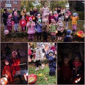 Heute waren alle kleinen und großen Kitaknirpse zu einem Laternenumzug eingeladen, um die Dunkelheit und die kleinen Geister zu vertreiben. Groß und Klein traf sich zahlreich vorm Kindergarten. Zur Einstimmung wurden wir mit einem Programm von den Kitaknirpsen und ihren Erzieherinnen begrüßt. Alle waren guter Stimmung und hatten ihre bunt leuchtende Laterne dabei. Diese zeigte sich in den unterschiedlichsten Formen, Farben und Größen. Es gab Dinosaurier zu entdecken oder zauberhafte Rehe zu bestaunen. Wir konnten uns von Einhörnern verzaubern lassen, mit Minimäusen lachen und von allerlei anderen Laternen befunkeln und den Weg beleuchten lassen. Wir Eltern hatten im Vorfeld die Möglichkeit, die Laternen für unsere Kinder selbst während eines Bastelelternabends zu gestalten. Wir ließen uns inspirieren und konnten so unserer Kreativität, mit den von der Kita bereitgestellten Bastelmaterialien, freien Lauf lassen und in den Momenten des Bastelns selbst einmal wieder ein klein wenig Kind sein.