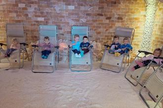 Am 26. Oktober 2024 gab es für unsere neue „Wildbienengruppe“ eine Überraschung. Bei herrlichem Herbstwetter fuhren wir mit einem Kleinbus vom Bauhof Richtung Neustadt. Schon mit dem Bus mitzufahren, war für die Kinder „cool“, wie sie meinten. Als wir dann am Kaufland vorbeifuhren, dachten einige, wir gehen jetzt einkaufen und die Mama von Lio besuchen. Aber die Fahrt ging noch ein kleines Stück weiter bis zum Parkplatz am Baumarkt zur Engel-Apotheke. Dort wurden wir herzlich begrüßt, legten unsere Sachen ab, schlüpften aus den Straßenschuhen und zogen uns die mitgebrachten Socken an. Nun öffnete sich die Tür vom Salzdom. Alle suchten sich zuerst einmal eine Liege und atmeten ganz tief ein. Dann spielten die Kinder in dem besonderen Sand. Es wurde gesungen, Atem- und Dehnübungen gemacht und Geschichten vorgelesen. Die Kinder waren begeistert von dem etwas anderen Vormittag.