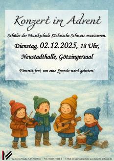 Wie in jedem Jahr in der Vorweihnachtszeit laden Schüler und Lehrer auch diesmal zum Konzert in die Neustadthalle ein. Das Adventskonzert findet am Dienstag, dem 02.12., 18:00 Uhr, im Götzinger Saal der Neustadthalle statt.