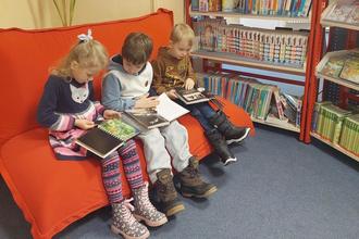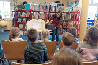 Anlässlich des bundesweiten Vorlesetages besuchten wir unsere Stadtbibliothek. Mit einem Kamishibai-Theater erzählte uns Frau Nachtigall die Geschichte vom verlorenen Schlüssel. Als der Schlüssel gefunden war, konnten wir die magische Truhe öffnen, in der sich einige Schätze der Bücherei befanden: Abenteuer- und Geschichtenbücher, Sach- oder Witzebücher, CDs, Spiele, DVDs sowie Tonieboxfiguren. Aber nicht nur in der Truhe waren solche Schätze zu sehen, sondern in all den vielen Regalen um uns herum - es war ein ganzes Haus voller Schätze!