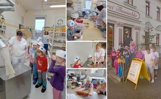 Am 11. Dezember 2023 gab es für unsere „Wildbienen“ einen Ausflug in die Bäckerei Thomschke nach Oberottendorf. Die Mama von Mira erwartete uns schon aufgeregt vor der Bäckerei. Die Kinder staunten über die großen Behälter für Mehl, die Teigwalze, den großen Backofen … Franzi ließ die Kinder verschiedene Körner erraten, u. a. Kürbiskerne, Sonnenblumen und Mohn. Einiges erkannten sie. Dann rollte der Papa von Mira mit der Teigwalze den Plätzchenteig aus und schon konnten alle mit dem Ausstechen beginnen und zwischendurch zeigen, wie gut sie schon mit dem Nudelholz umgehen können. Das war eine große Freude. Nach dem Backen ging es ans Verzieren der Plätzchen und der Spaß ging weiter, denn auch an den Kindern klebte der Schokoladenguss. Alle gaben sich große Mühe beim Gestalten der Kekse. Jedes Kind konnte noch ein Pfefferkuchenherz ausstechen, wo nach dem Backen dessen Name mit Schokoladenguss darauf geschrieben wurde. Wir bedankten uns herzlich beim Team der Bäckerei für diesen wunderschönen Vormittag. Bei herrlichem Sonnenschein liefen wir zur Haltestelle Müller-Mühle. Da wir noch etwas Zeit hatten, erklärte Frau Marschner den Kindern das „Bücherbushäuschen“. Die Kinder suchten sofort Bücher aus. Bereits am Nachmittag bekamen wir unsere Kekse „geliefert“. Dankeschön an das Team der Bäckerei Thomschke sagen die