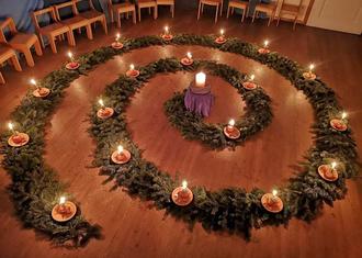 Ganz still und andächtig ziehen wir in unseren dunklen Bewegungsraum ein, zu leiser Klaviermusik, um dann durch die Spirale aus lauter Tannenzweigen hin zum Licht, zu ziehen. Dort zündet jedes Kind eine Apfelkerze an und stellt diese auf das Tannengrün. Wir suchen unsere Mitte, kommen zum Kreuz und finden Ruhe.