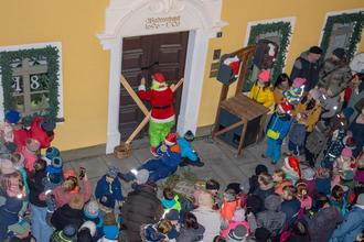 Am 1. Dezember startete der Rathaus-Advents-Kalender zur Freude aller Kinder. Diese waren wieder zahlreich mit ihren Eltern am Rathaus, um das erste Fenster zu öffnen und den Weihnachtsmann zu wecken. Doch dieses Mal öffneten nicht die Kameradinnen und Kameraden der Neustädter Feuerwehr die Rathaustür, sondern der Grinch positionierte sich frech davor, nagelte diese sogar zu und sperrte den Weihnachtsmann, der vom Lärm an der Tür aufgeweckt wurde, einfach ein.