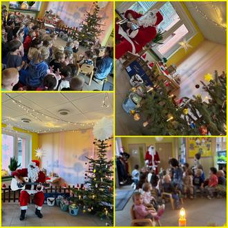 Mit unseren Liedern weckten wir offenbar jemanden, denn plötzlich stand er vor unserer Tür: der Weihnachtsmann höchstpersönlich! Die Augen der Kinder leuchteten vor Staunen und Freude. Als unser Weihnachtsmann dann auch noch seine Gitarre hervorzog war die Begeisterung komplett.