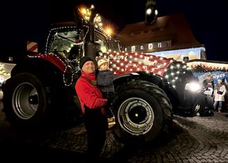 Die Weihnachtstraktoren begeisterten am 5. Dezember 2024 nicht nur die kleinen Besucher, wie Frank Bergemann mit seinem Enkel