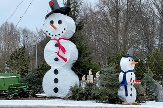 Diese beiden Schneemänner sind ein schöner Willkommensgruß für alle Vorbeifahrenden