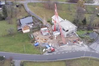 Blick von oben auf die Baumaßnahme für den neuen Anbau am Feuerwehrgerätehaus in Krumhermsdorf im November 2023, Foto: Enrico Bartsch