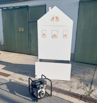 Zum anderen wurde eine komplette Spritzwand zum Zielspritzen, welche nicht nur für die Nachwuchswerbung, sondern auch für die Ausbildung in den Jugendfeuerwehren eingesetzt werden kann, angeschafft. Während die Handpuppe und die tragbare Motorpumpe reine Kaufteile waren, wurde die eigentliche Spritzwand im Eigenbau gefertigt. Hier bot der Markt einfach nicht derartiges an.