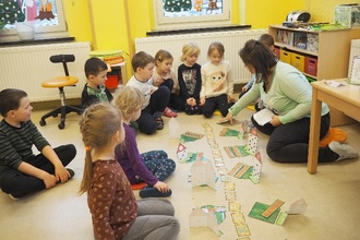 Jeden Donnerstag steht bei uns Zwitscherlingen die Vorschule auf dem Programm. Ausgestattet mit Federmappe, Stifte, Schere und Malfarben haben wir schon vieles Neues gelernt und ausprobiert. Doch die letzte Vorschuleinheit begann anders als sonst. Uns erwartet eine Reise ins Zahlenland. Dort gibt es zehn verschiedene Häuser, mit eigenen Vorgärten, Beeten und eine Straße, welche durch die gesamte Zahlenstadt verläuft. Aber was war das? Huschte doch nicht etwa ein kleiner Kobold durch die Stadt und brachte alles durcheinander. Da war auf einmal der Rasen von Haus ACHT, bei Haus FÜNF. Und das Beet von Haus EINS stand hinter Haus SIEBEN! Was war nur passiert? Weil wir ja sehr pfiffig sind, haben wir schnell herausgefunden, dass der Kobold Kuddelmuddel sein Unwesen getrieben hat. Bloß gut, dass wir einen Zauberspruch wussten, welcher alles wieder richten kann. Und so geht er: „Kuddelmuddel, welch ein Schreck – zaubert uns die Zahlen weg. Komm herbei Vergissmeinnicht – jage weg den Bösewicht!“ Was hatten wir für ein Glück, dass wir mit dieser Zauberformel die Hilfe der Fee Vergissmeinnicht bekamen und die Ordnung in unserer Stadt wiederhergestellt wurde. Wir bleiben weiterhin sehr gespannt, mit was für verrückten Ideen uns der Kuddelmuddel noch überraschen wird.