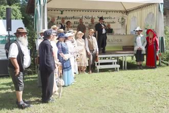 Offizielle Eröffnung des Wald- und Jagdtages im Jahr 2023 durch die Veranstalter gemeinsam mit dem Herrschaftspaar (vor der Bühne rechts) und der Geißbockfamilie aus Meckenbeuren (vor der Bühne links)
