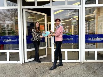 Symbolische „Buch- und Türübergabe“ von Katrin Gräfe (rechts) an Kathleen Nachtigall am 1. November 2023