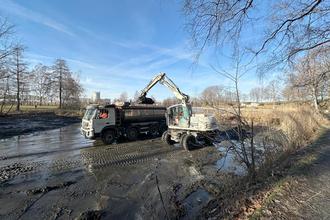 Schlämmen des Vorwärmbeckens am Freibadesee durch die Mitarbeiter des Städtischen Bauhofs Ende Januar 2024