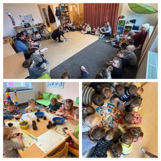 Unser Gemeinschaftsbild ziert nun unsere Tür an der Garderobe und kann von allen Eltern bestaunt werden. Am Mittwoch fand eine Winterolympiade statt. Bei Stationen, wie Skispringen, Pustefußball, Schneeballbalance, Schneeballzielwerfen und Wettanziehen konnte jeder sein Können unter Beweis stellen. Am Donnerstag war dann unser Winterkonzert, bei dem jede Gruppe sein einstudiertes Winterlied präsentieren konnte. Es wurde getanzt und mit Instrumenten gespielt. Sogar die Kleinsten führten etwas zum Lied „Schneeflöckchen“ vor. Zum krönenden Abschluss fand am Freitag dann noch unser Interessentag statt. Die Kinder konnten zwischen Schneebälle backen, Entspannung, Futterzapfen herstellen, „Die Geschichte vom Handschuh“ und Bewegung an der frischen Luft wählen.