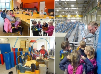 Am 24.02.2023 war es so weit, die „Hummeln“ konnten zur Firma Gerodur „fliegen“. Alle Kinder waren im Vorfeld aufgeregt und neugierig, was sie so erleben werden. Da das Wetter etwas unbeständig war, fuhren wir mit einem Kleinbus vom Bauhof zur Firma. Dort wurden wir wieder sehr herzlich von Frau Blut, Herrn Schwenke und Herrn Petschel empfangen. Zuerst erklärte uns Frau Blut viel über den Betrieb, danach gab es einen Rundgang. Dafür teilten wir uns in vier Gruppen auf. Wir staunten über die langen Maschinen, großen Rollen mit Rohrleitungen für Trinkwasser, Abwasser und Gas. Ein Stapler fuhr ohne Fahrer durch die großen Hallen und transportierte die gefüllten Paletten. Im hohen großen Lager staunten wir über die vielen, schon gepackten Rohrrollen. Eine Überraschung waren die Hula-Hoop-Reifen, die der Auszubildende Tom für uns gefertigt hatte. Es gab sogar Süßigkeiten in Form von Rohren, wie Lakritzschnecken mit verschiedenen Geschmacksrichtungen. Wir bedanken uns recht herzlich bei Frau Blut, Frau Wuttke, Herrn Petschel und Herrn Schwenke für die interessante Führung durch den Betrieb und den einzigartigen Vormittag!