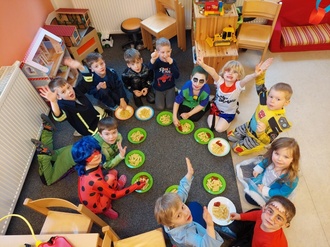 Nach einem dreifachen „Zicke-Zacke“ wurde das bunte Buffet geplündert. Die Eltern, Omas und Opas haben sich sehr viel Mühe gegeben und viele Köstlichkeiten für die Kinder gezaubert. Anschließend wurde unsere Faschingsparty mit einer Polonäse begonnen. Wir zogen durch unsere Kita und die Tagespflege von Kathrin Vogel. Nun konnten die Kinder verschiedene Räume besuchen. Sie hatten die Wahl bei einer Disco das Tanzbein zu schwingen oder lustige Partyspiele zu spielen oder bei Snacks und an der Bar eine Auszeit zu genießen. Und wer noch Platz für ein Glitzer-Tattoo hatte, konnte sich seine Arme noch verschönern lassen. Zum Abschluss gab es große Nudeln mit Ketchup. Wir durften dabei sogar auf dem Boden sitzen und mit den Fingern essen. Voller Freude fielen alle erschöpft in ihre Betten. Was für ein Tag!