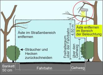 | o | Über den Fahrbahnen ist ein Bereich von 4,50 Meter Höhe und über den Geh- und Radwegen von 2,50 Meter Höhe freizuhalten (Lichtraumprofil), damit Fahrzeuge beziehungsweise Fußgänger und Fahrradfahrer die öffentlichen Straßen entsprechend ihrer Bestimmung nutzen können. |