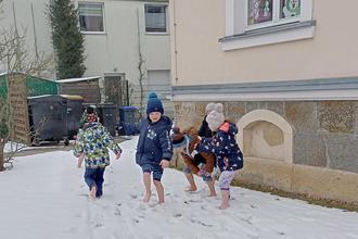 Da Frau Holle doch noch etwas Schnee geschickt hatte, konnten wir wieder einmal barfuß im Schnee laufen. Natürlich wurden die Eltern vorher um Erlaubnis gefragt, auch die Kinder, nur wer wollte, machte mit. Das Schneetreten härtet ab, vertreibt die Wintermüdigkeit. Barfuß durch den Schnee zu laufen, regt den Kreislauf an, fördert die Durchblutung und stärkt unsere Abwehrkräfte. Auch Wasser- und Tautreten sind sehr gesund! Sebastian Kneipp lebte von 1821 - 1997 und wusste Mitte des 19. Jahrhundert vom Nutzen des Temperaturwechsels für den Organismus. Unsere „Sammelbienen“, die Vorschüler, waren mit großer Begeisterung dabei.