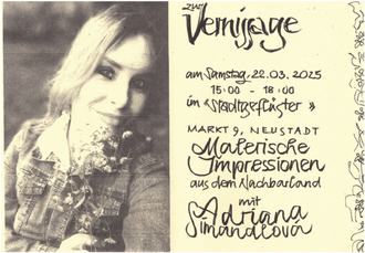 Die Ausstellung im „Stadtgeflüster“ kam zustande durch eine persönliche Initiative von Bernd Miller. Dabei wurde er unterstützt durch Kornelia Mittler, Reinhard Schreiter und durch das Stadtmanagement, insbesondere durch Gisela Förster. Ein schönes Geschenk für das Stadtgeflüster, welches seinen ersten Geburtstag feiert. Zu sehen ist die Ausstellung zu den üblichen Öffnungszeiten vom 22. März bis Anfang Mai 2025. Danach werden die Werke von Adriana Simandlová wieder in den Cafés „Venezia“ und „Stodola“ im tschechischen Rumburk für einladende Atmosphäre sorgen. Termin: 22.03.2025, 15:00 Uhr