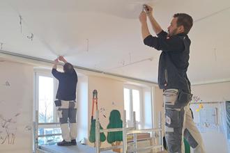 Ronald Wichmann und Ronny Förster bei den Renovierungsarbeiten an der Decke