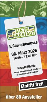 Der Verein „Gemeinsam für Neustadt“ e. V. lädt Sie zur 4. Neustädter Gewerbemesse am 8. März 2025 in die Neustadthalle ein. Eröffnet wird die Gewerbemesse 10:00 Uhr von Bürgermeister Peter Mühle gemeinsam mit der Vereinsvorsitzenden Kathrin Vogel. Danach werden Staatssekretär Thomas Kralinski und Landrat Michael Geisler Grußworte überbringen.