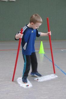 Mit flotten Rhythmen wurden die Kinder empfangen. Der „Gute-Laune-Song“ riss dann auch den letzten Zögerer mit und gleichzeitig waren alle Muskeln erwärmt. Nun konnte der Wettbewerb losgehen. Es gab insgesamt sechs Stationen für die Kinder, welche sie mit Feuereifer absolvierten. Da mussten Schneemannteile in den Schatten gebracht und zusammengepuzzelt werden, natürlich immer auf Zeit. Es gab eine Schneeball-Zielwurfstation mit vorherigem „Tauchgang“ durch einen dunklen Tunnel. Dass die Schneebälle aus Papier waren, störte dabei niemanden. Teppichfliesen waren Eisschollen und die Wischmopps aus der Kita unsere Skier. Zum Schluss mussten noch Handschuhpaare sortiert und auf die Leine geklammert werden. Alle hatten riesigen Spaß und erholten sich zwischendurch an einer kleinen Trinkstation.