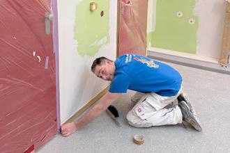 Ein Mitarbeiter des Malermeisters Hardegen beim Malern des Gangbereiches der Julius-Mißbach-Grundschule