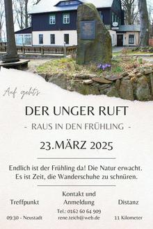 Unsere erste Wanderung startet am 23. März 2025 unter dem Motto „Der Unger ruft - raus in den Frühling“. Von Neustadt aus werden wir über wunderschöne Wanderwege den Unger mit seinem Prinz Georg Turm erklimmen. Anschließend geht es bei hoffentlich schönstem Wanderwetter wieder zurück in Richtung Neustadt in Sachsen. Informationen zur Wanderung bei R. Teich unter 0162 6064909 oder unter rene.teich@web.de.