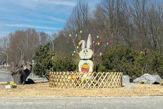 Blick auf das österlich gestaltete Rondell am Kreisverkehr