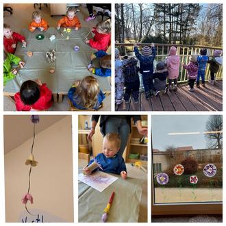 und damit auch die Frühlingszeit, auf die wir schon gewartet haben. Der Frühling bringt uns wieder mehr Sonnenschein, bunte Farben und alles beginnt zu blühen. All das, was zum Frühlingsbeginn gehört haben wir Nesthüpfer im Morgenkreis zusammengetragen und natürlich mit tollen Liedern und Fingerspielen vertieft. Bei Spaziergängen durch die Natur sind wir auf die Suche nach verschiedenen Frühblühern gegangen und wir waren sehr erfolgreich. Die Vögel zwitschern und alles erstrahlt in bunten Farben. Diese Farben- und Blumenpracht hat uns motiviert, unser Gruppenzimmer zu dekorieren und auch hier den Frühling einkehren zu lassen. Also hieß es: „Auf die Pinsel fertig los!“. Es wurde geklebt, getupft und aus Eierkarton geschnittene Blüten bemalt. Im Nu erstrahlte auch der Krippenbereich im Frühlingsglanz. Wir freuen uns auf weitere tolle Erlebnisse und machen uns dann so langsam bereit für die Osterzeit.