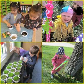 Bei den Regenbogenknirpsen staunten Hans und Jette. Die Kinder befüllten kleine Joghurtbecher mit Erde und streuten Samen darauf. Täglich gossen sie und schauten, ob sich erste grüne Spitzen zeigten. Eines Morgens rief eines der Kinder: „Juhu, unser Gras ist gewachsen!“ Die Kinder bastelten ein kleines Häschen, dass sich dann im Ostergras versteckte. Auf einmal lagen noch zwei kleine bunte Schokoeier darin. Wer das wohl war? Voller Stolz zeigten die Regenbogenkinder ihr selbst gestaltetes Osternestchen ihren Eltern und nahmen es mit nach Hause.